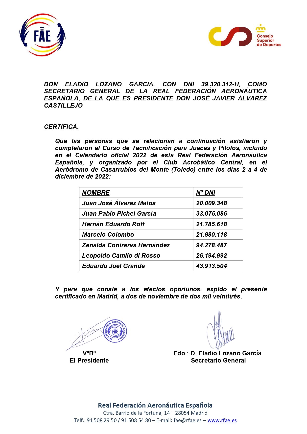 Entre los días 2 a 4 de diciembre del año 2022, organizado por el Club Acrobático Central tuvo lugar en el Aeródromo de Casarrubios del Monte, Toledo, España, el Curso de Tecnificación para jueces y pilotos de vuelo acrobático, evento perteneciente al calendario oficial de la Real Federación Aeronáutica Española y que fue brindado por los Sres. Eladi Lozano García y Guy Auger, ambos jueces internacionales FAI-